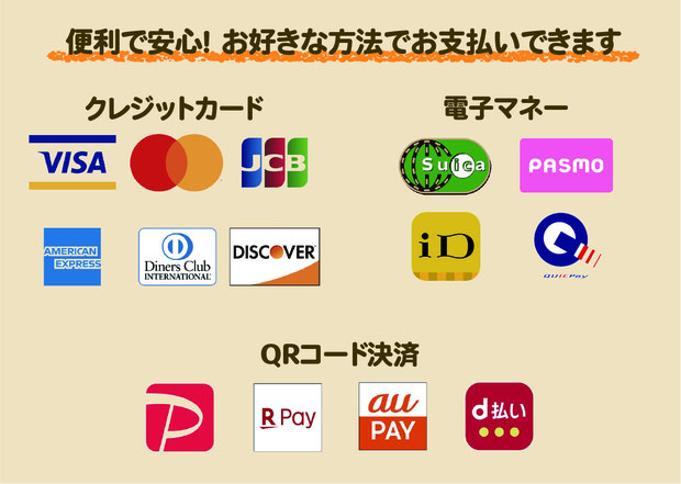 当店では現金のほか、クレジットカード・交通系電子マネー・QRコード決済に対応しています。便利にご利用ください。